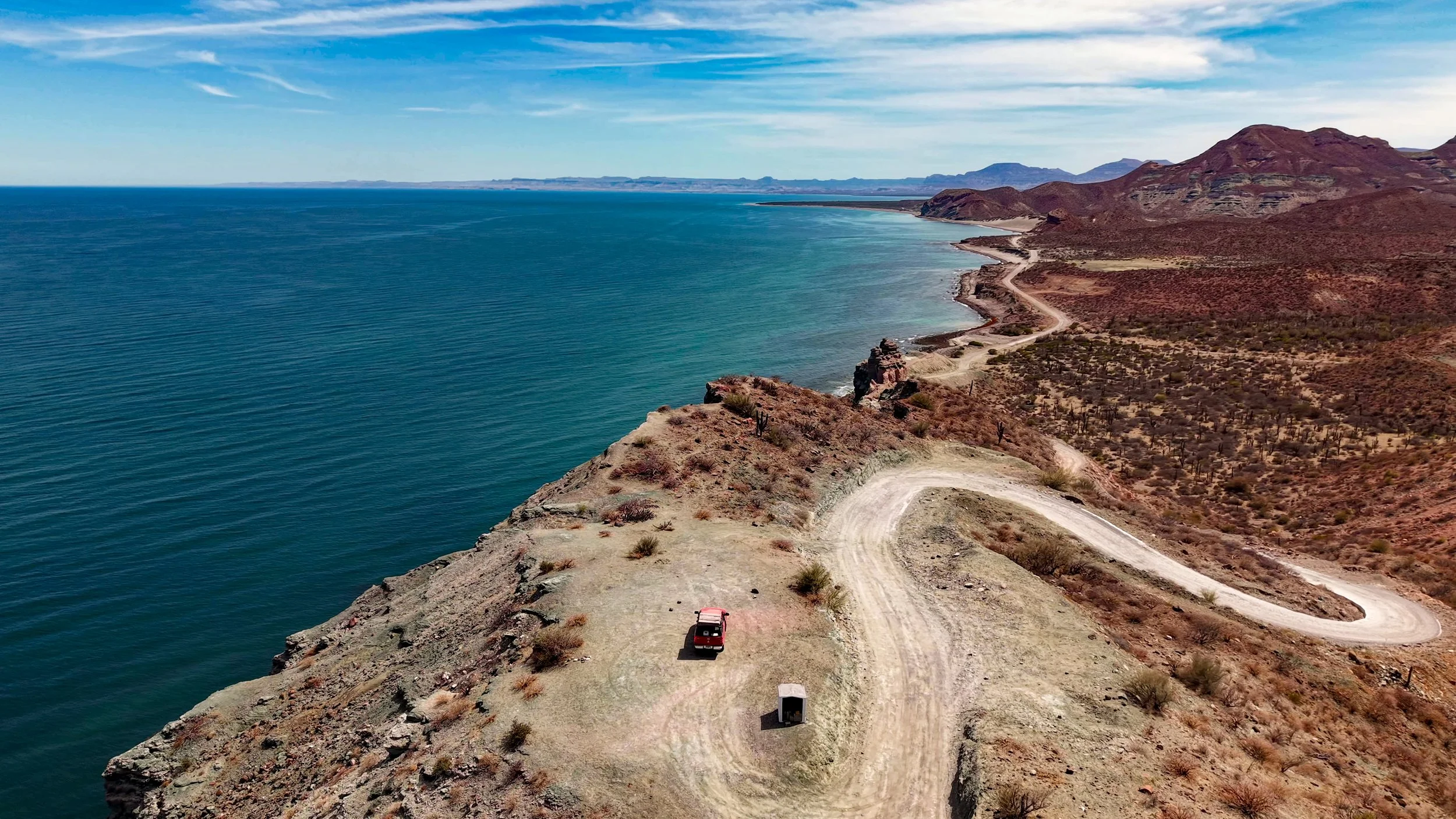 La ruta se estrecha, las montañas se cierran y el Golfo de California aparece y desaparece entre curvas como un reflejo que te guía.